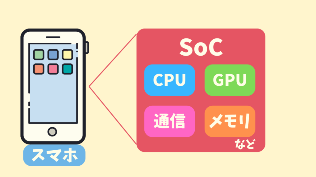 SoC(System on a Chip)とは、スマートフォンやタブレットなどのモバイルデバイスにおいて、CPU(中央処理装置)、GPU(グラフィックス処理装置)、モデム、メモリコントローラなど、複数の機能を一つのチップに集積したものです。