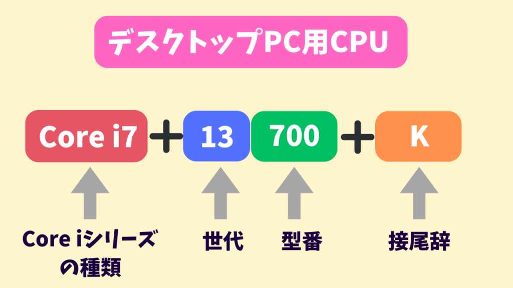 デスクトップパソコン用のCPUの接尾辞は以下の通りとなっています。